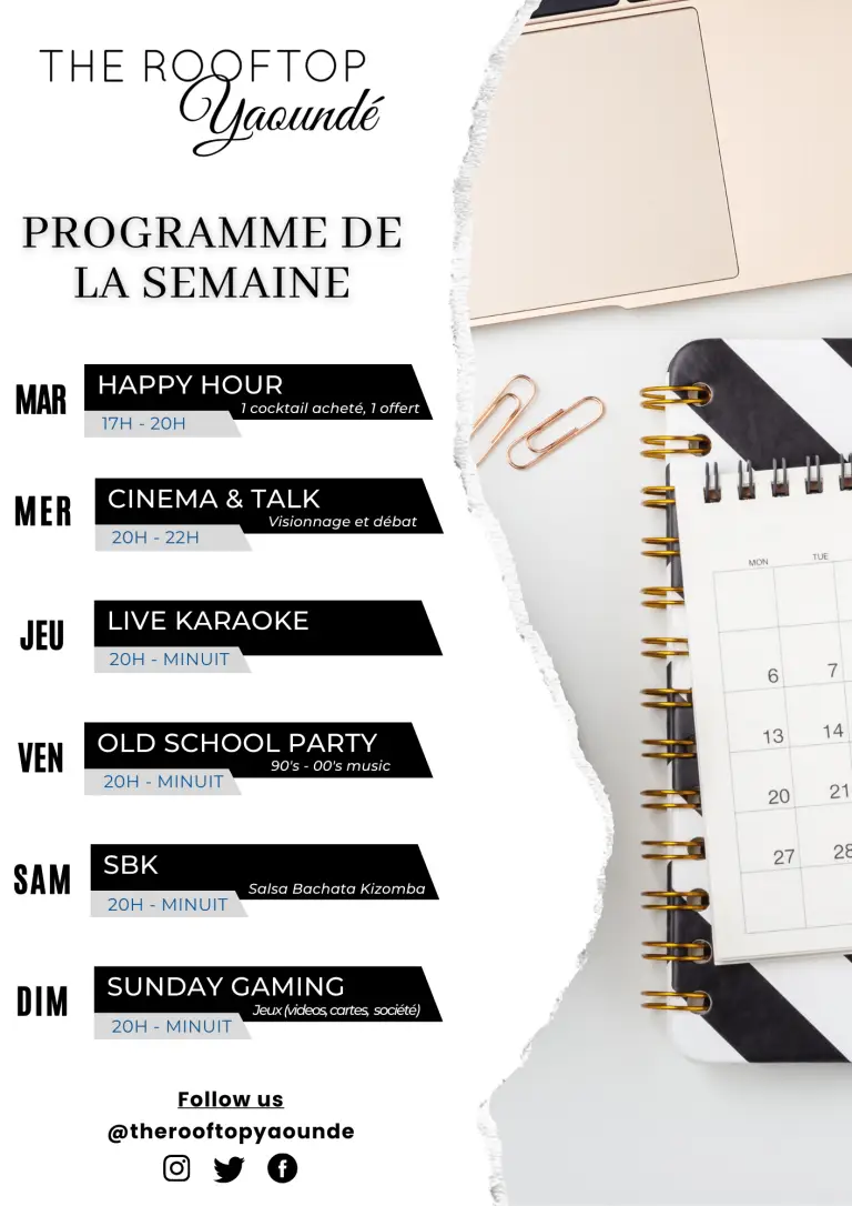 Inauguré le 17 décembre 2020, The Rooftop Yaoundé s’impose comme l’adresse panoramique incontournable de la capitale. Niché au sommet d’un immeuble au cœur de la ville, notre restaurant offre une expérience culinaire raffinée alliant gastronomie contemporaine, ambiance élégante et vue imprenable sur Yaoundé. Plus qu’un lieu de restauration, The Rooftop Yaoundé est un espace de convivialité, d’émotions et de découvertes, où chaque instant se savoure avec hauteur.